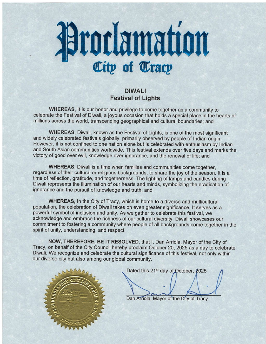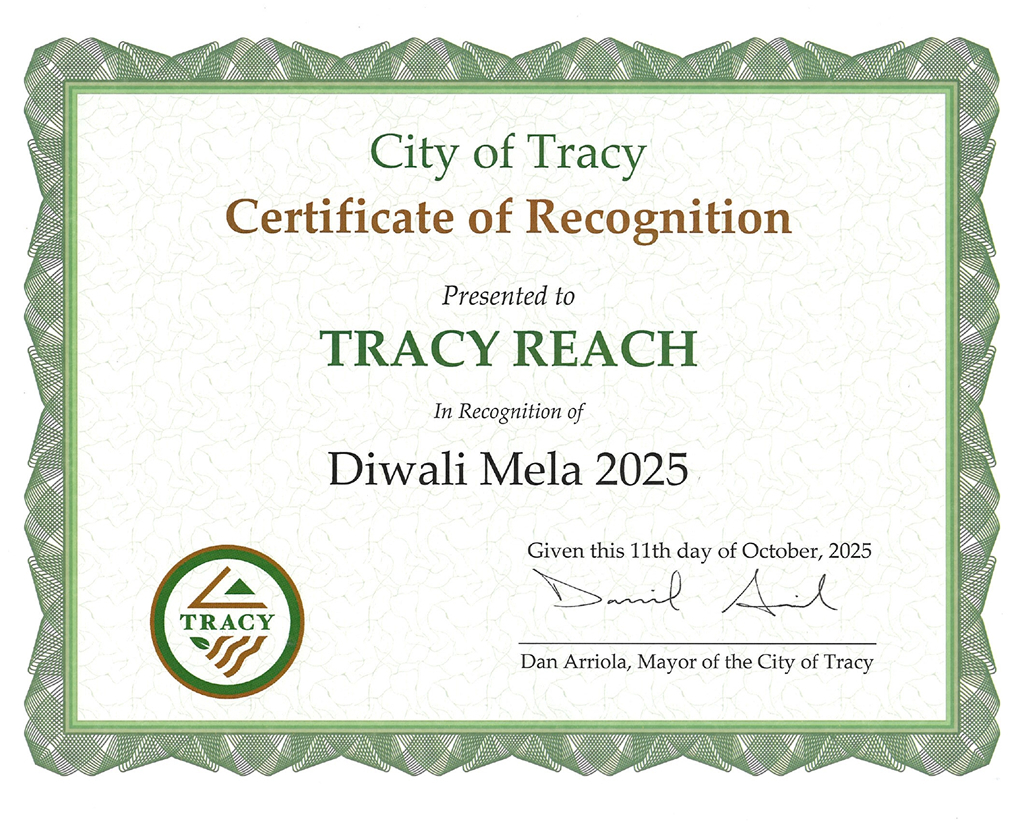Robert Rickman, San Joaquin County 5th District Supervisor, presented Tracy REACH with a Certificate of Recognition for Diwali (Festival Of Lights) in 2024.